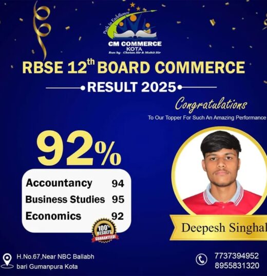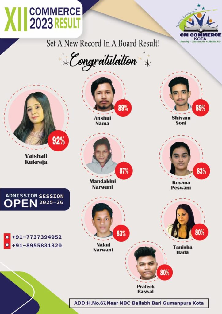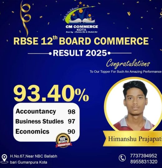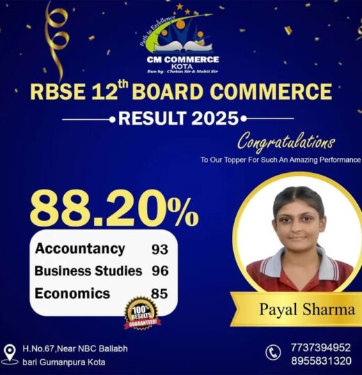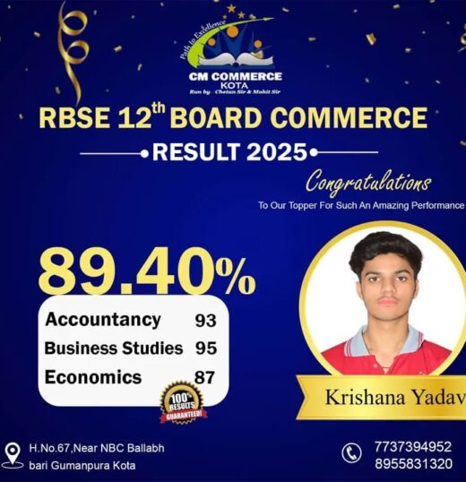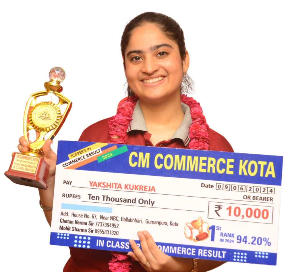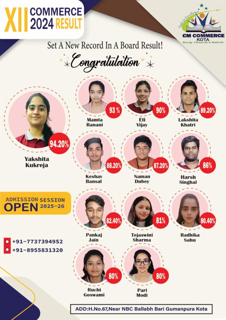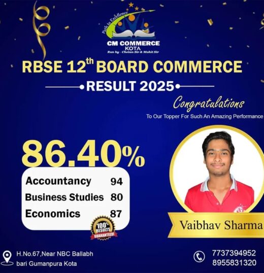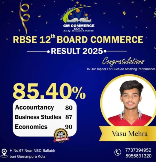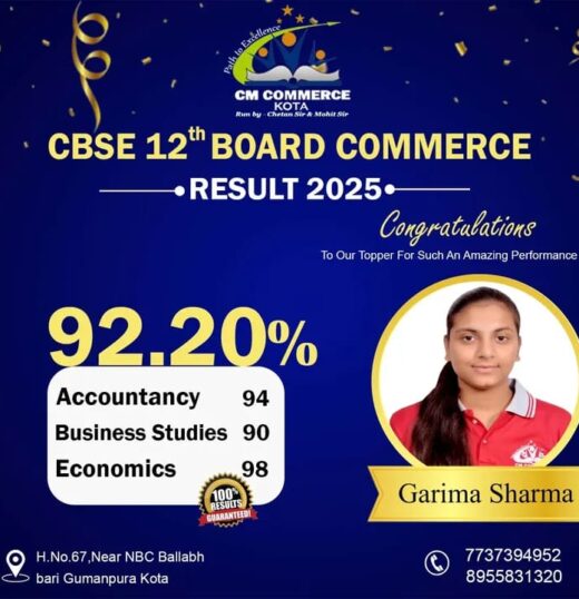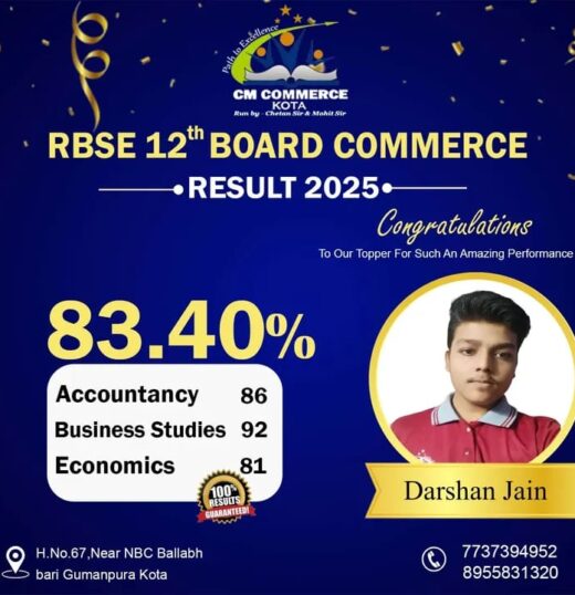 CM Commerce Kota is a trusted name in commerce education, dedicated to academic excellence and student success. With experienced faculty, structured teaching methods, and consistent results, we help students achieve their goals in XI, XII, and B.Com.